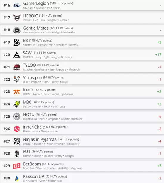 在第11至20名区间,FaZe战队暂居第11位,他们正蓄势待发准备重返前十。本阶段进步最明显的是SAW战队,飙升17个名次的战绩令人惊叹。