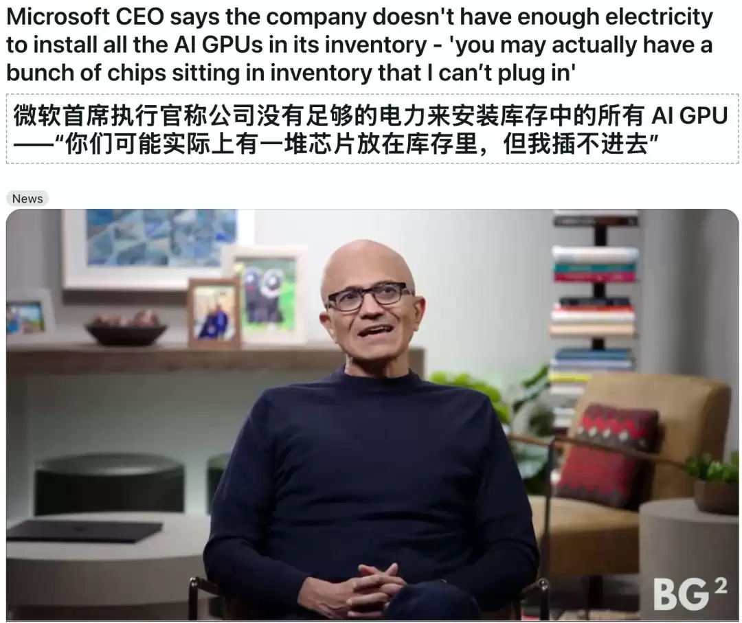 纳德拉坦言:当前面临的主要问题并非芯片数量不足,而是缺乏能够直接安装设备的"温暖机房"(Warm Shell)。