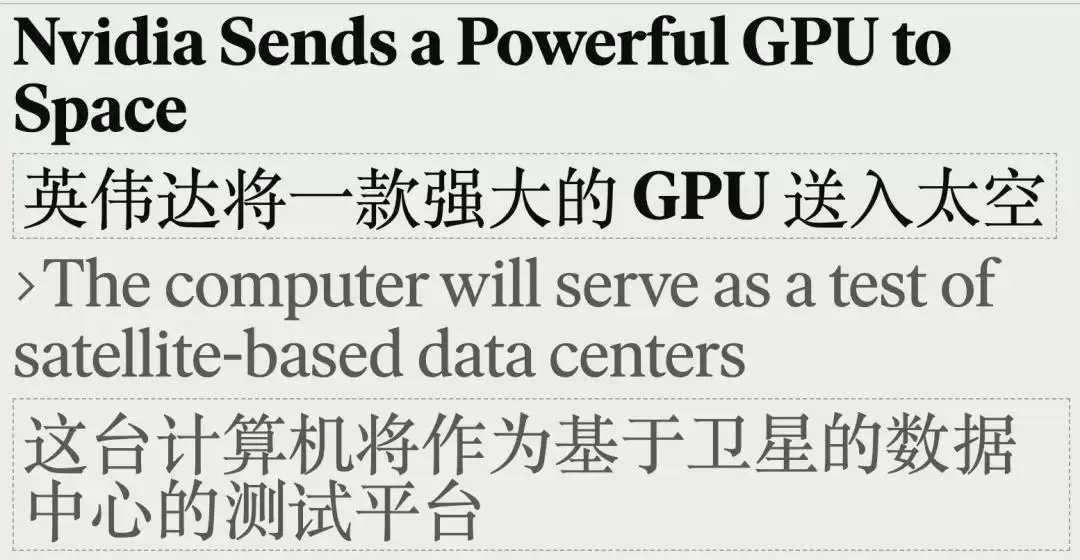 另一则消息则是英伟达的H100 GPU被送上轨道,准备在太空中搭建数据中心。