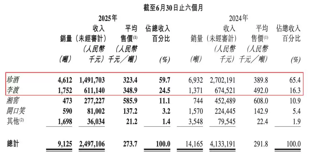 2025年上半年,作为公司"顶梁柱"的珍酒实现营收14.92亿元,同比下降44.8%;销量由去年同期的6932吨收缩至4612吨,均价由38.98万元/吨下探至32.34万元/吨。