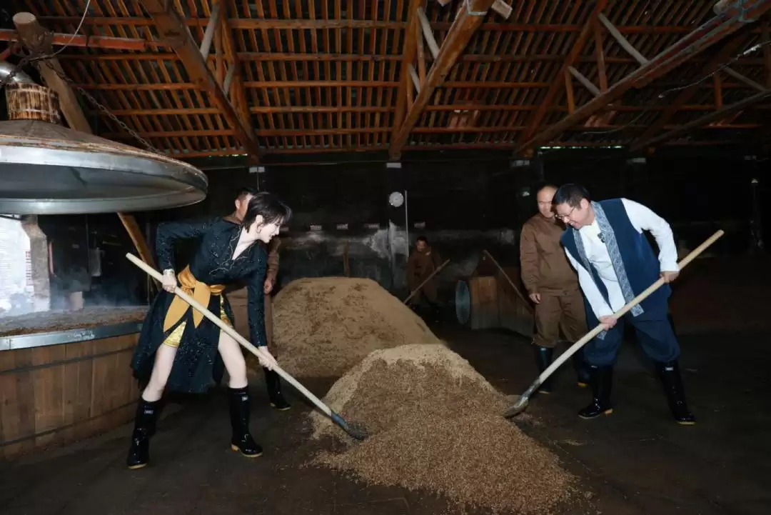 近日,姚安娜深入李渡古镇,扛起铁锹,亲手参与糟醅的翻拌,步入素有"中国烧酒祖庭"之称的酿酒圣地,与元代的古窖默默对话。