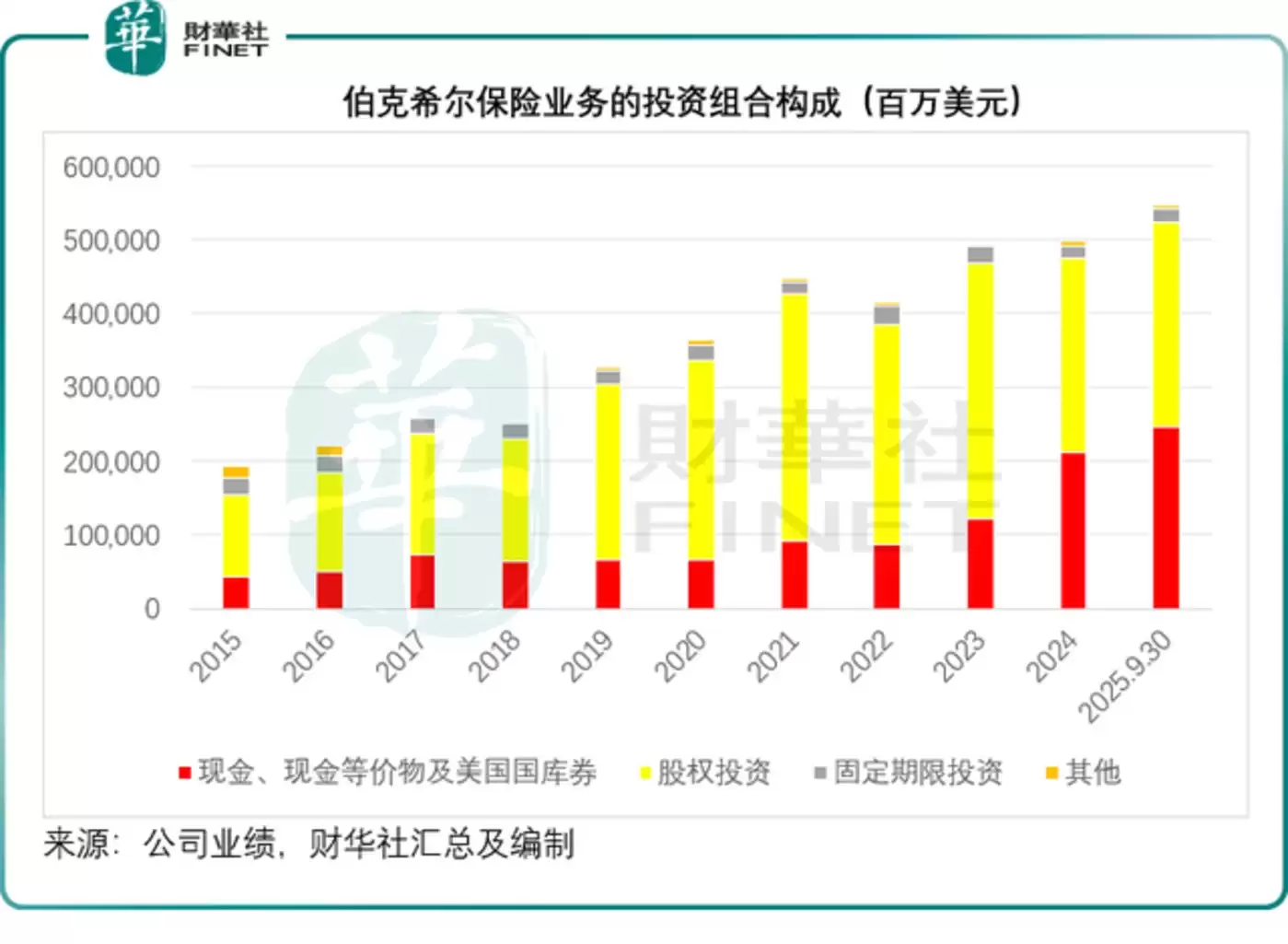 其投资主要依赖于巴菲特优秀的“选股”技能,因此不同于其他保险公司的投资组合以固定收益证券为主——以平衡其保险业务的现金流久期,伯克希尔的投资组合倾向于风险较高的股权投资。