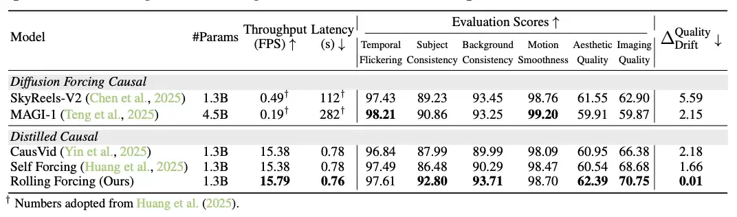 如表示所示,Rolling Forcing 在多项关键指标上超越了现有主流方法。其最突出的优势体现在长期一致性上:衡量视频质量漂移的关键指标 ΔDriftQuality 远低于对比模型,这证明其有效抑制了长视频生成中的误差累积。同时,该方法在单张 GPU 上达到了 16 fps 的生成速度,实现了实时生成,为交互式应用奠定的基础。