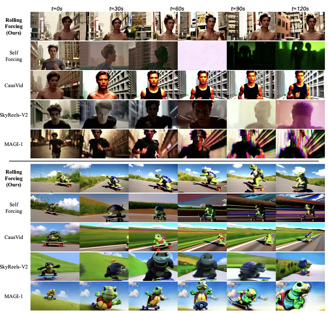 在长视频生成的定性比较中,Rolling Forcing 的优势更为直观。在长达 2 分钟的生成过程中,对比模型普遍出现了明显的色彩偏移、细节退化或主体变形,而 Rolling Forcing 生成的内容在细节、色彩和运动连贯性上均保持了高度稳定。