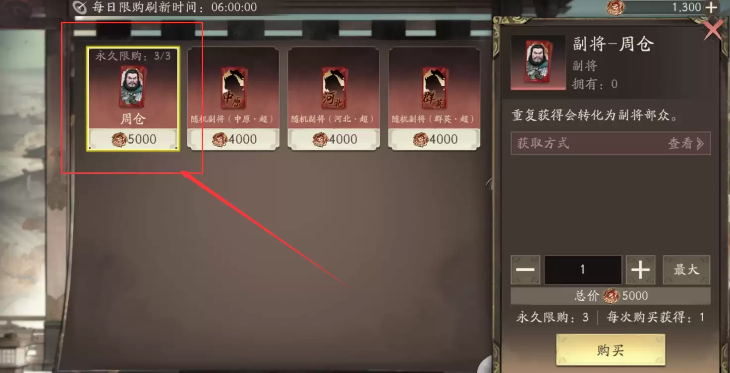 第三种方法是直接在游戏商城中兑换。玩家使用五千枚副将碎片,即可直接兑换一名周仓。此外,在该商店中还可以兑换三个周仓单位,用于强化角色属性。