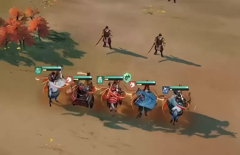 接下来是站位安排。由于夏侯惇是比较肉的前排,建议让他顶在最前面。开场会先刷新两个小兵,此时可以让曹操站在这两个小兵之间快速清掉,这样全队都能获得攻击力加成。另外注意保持角色间距,不要拉得太开,这样更容易触发合击效果。