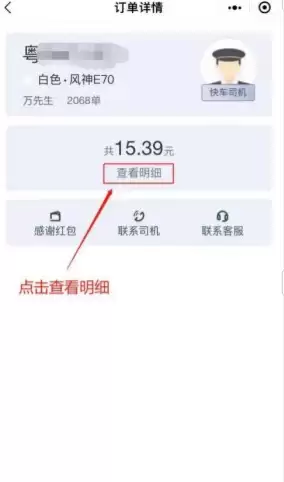 4、在"费用明细"页面,您可以清楚查看该订单的起步价、里程费、时长费等详细的费用构成信息。