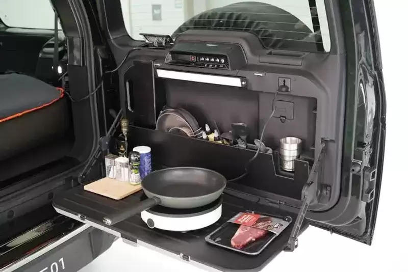 不过,最引人注目的当属智己LS9独特的车载淋浴功能。根据多位博主实测,只需打开车尾门,就能在上面悬挂一个单人淋浴间。供水系统则依靠后备箱内10L容量的水箱,并且水箱可接入车载220V电源,随时提供热水,为长途旅行或户外探险带来极大便利。这一创新设计并非车企首次尝试拓展车辆功能,此前极石汽车就曾推出车尾厨房系统,通过展开桌板形成一个简易的厨房操作区,并配有专属厨房电器工作区,可连接220V对外放电接口,充分满足了用户多元化的使用需求。