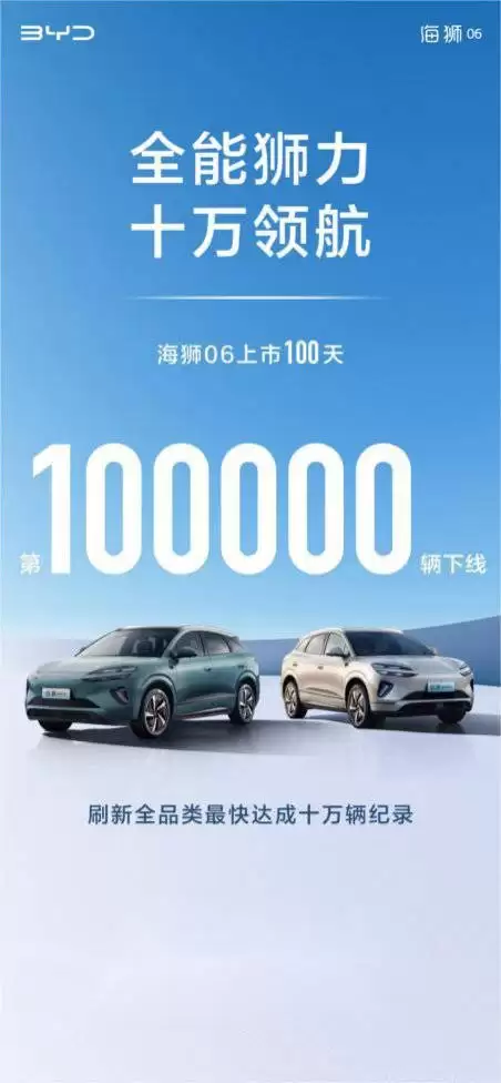 比亚迪海洋网旗下的“高能超享SUV”海狮06迎来重要里程碑——上市仅百日之际,第十万辆整车已正式下线。这一成绩不仅刷新了全品类车型突破十万辆的最快纪录,更以惊人的“海狮06速度”展现出强大的市场号召力,为主流SUV市场树立了全新的价值标杆。