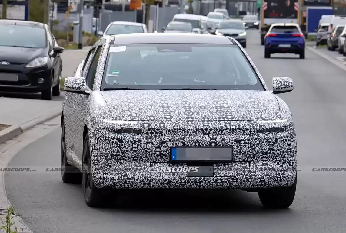 从谍照来看,虽然测试车仍覆盖着伪装贴纸,但整体轮廓已与概念车设计十分接近。前脸采用封闭式格栅设计,上方配备两条纤细的分体式LED大灯,中央贯穿式装饰条延伸至两侧,形成独特的视觉标识。下包围区域虽被严密遮挡,但根据设计逻辑推测,该处可能设有扁平化通风口,为电池组提供散热功能。