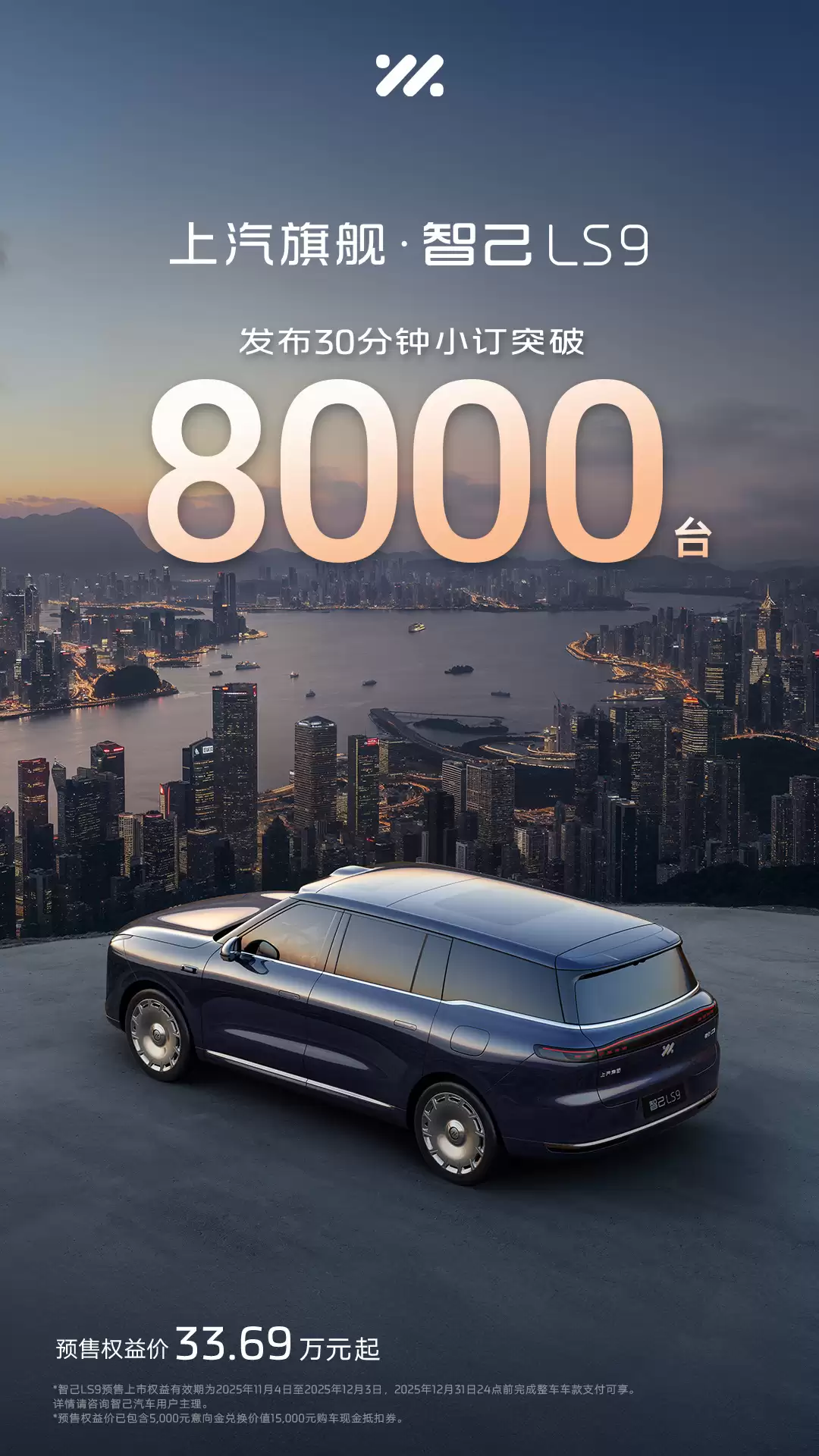上汽集团旗下的高端品牌智己汽车近日正式开启了旗舰大六座SUV——智己LS9的预售。新车接受预订后仅半小时,小订订单量就突破8000台。这一亮眼表现不仅印证了消费者对智己品牌的认可,更折射出大六座SUV细分市场依然保持着旺盛的需求势头。