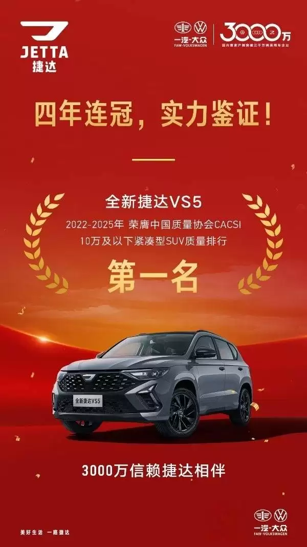 捷达的品质实力不仅体现在用户口碑上,更在权威评选中得到了充分认可。根据中国质量协会发布的“中国汽车行业用户满意度指数(CACSI)”测评结果,捷达品牌旗下车型屡获殊荣。其中,捷达VS5自2024年起连续四年蝉联“10万及以下紧湊型SUV”用户满意度第一。捷达VA3、VS5、VS7在2024年也分别在各自细分领域夺得用户满意度冠军。这些荣誉不仅是对捷达传承德系品质的肯定,更是一汽-大众精准把握中国市场需求的最佳证明。