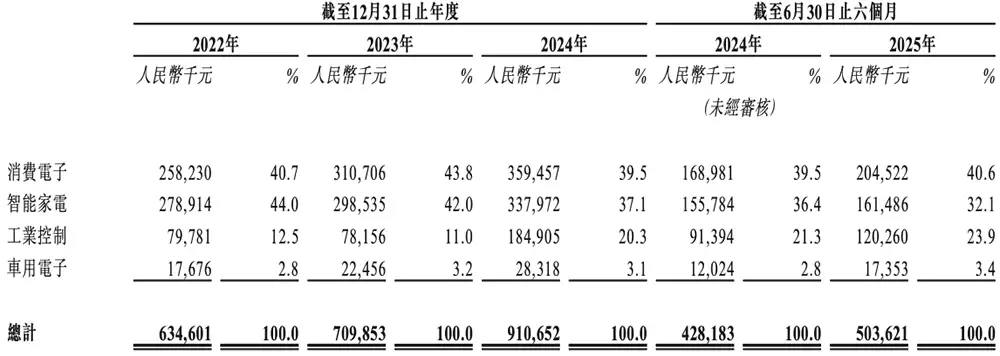 2025年上半年,消费电子、智能家电、工业控制及车用电子四大应用场景,分别贡献了中微半导体总收入的40.6%、32.1%、23.9%和3.4%。