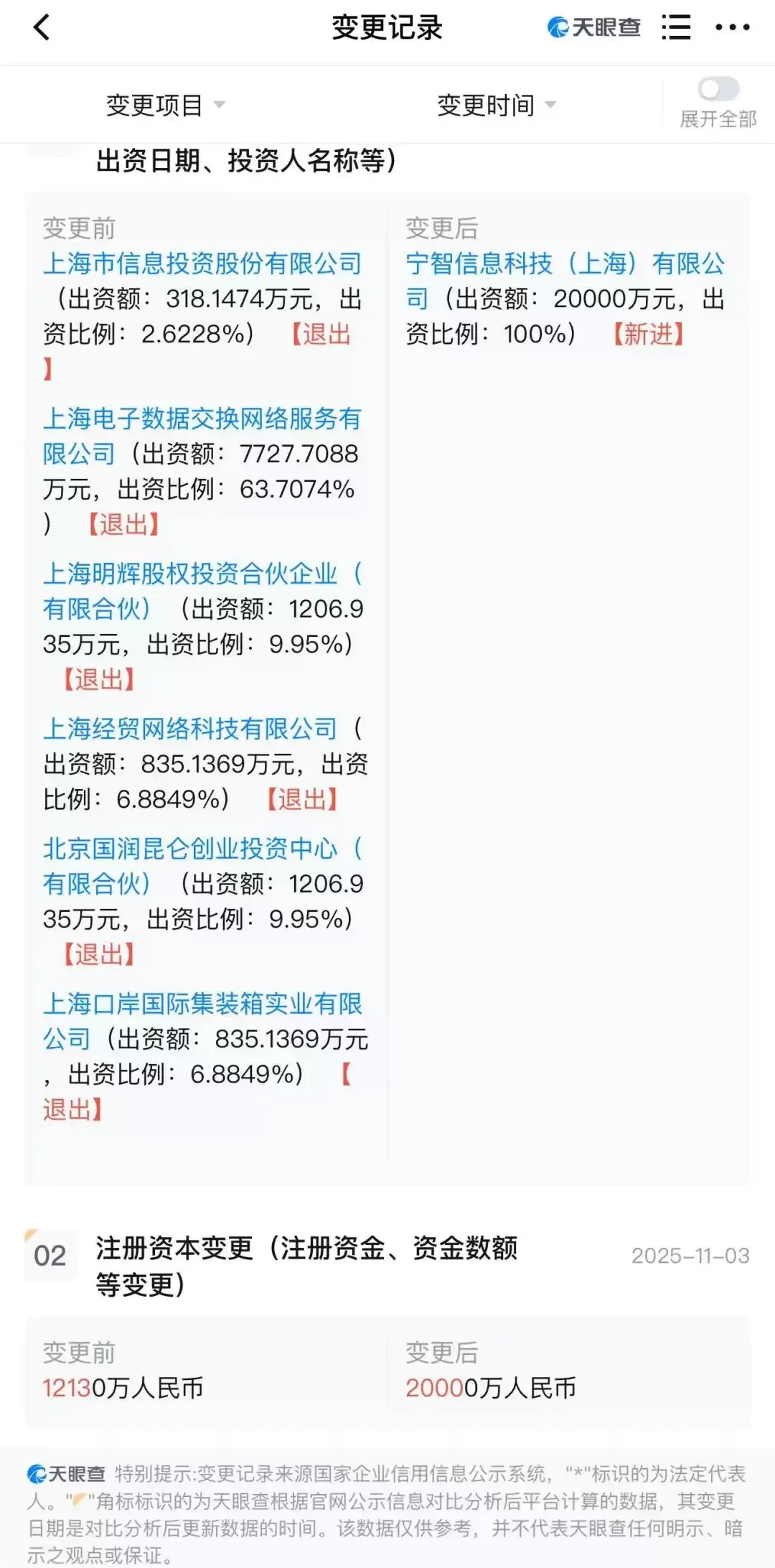 天眼查的历史股东信息显示,在此之前,东方支付曾有6家股东,但均于2025年11月4日退出。作为发起股东,上海电子数据交换网络服务有限公司自2010年起持股,退出时的持股比例达63.7074%,认缴出资额约77.27亿元。第二、三家股东上海明辉股权投资合伙企业(有限合伙)和北京国润昆仑创业投资中心(有限合伙),均于2013年首次入股,退出时持股比例均为9.95%,认缴出资额均为1206.935万元。第四、五家股东上海经贸网络科技有限公司与上海口岸国际集装箱实业有限公司,均为2010年首批股东,退出时持股比例均为6.8849%,认缴出资额均为835.1369万元。第六家股东上海市信息投资股份有限公司于2010年首次入股,退出时持股比例为2.6228%,认缴出资额为318.1474万元。
