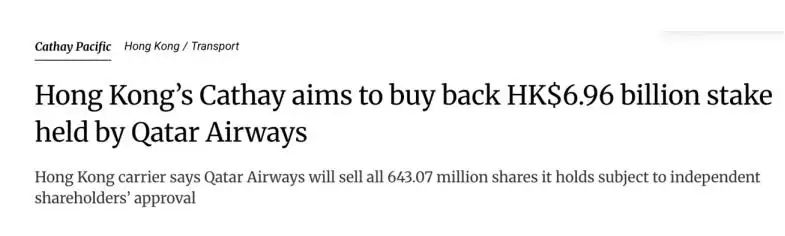 香港国泰航空宣布,计划以约69.6亿港元(约合8.96亿美元)回购卡塔尔航空持有的全部股份,这项收购仍需获得国泰独立股东批准。