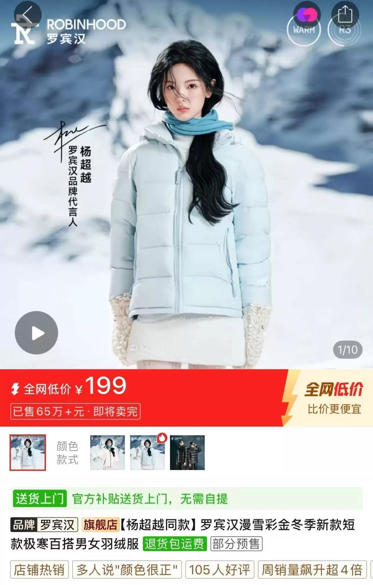 “必须打造自主品牌,必须全力拥抱线上。”徐忠的转型决策果断而彻底。2022年,他斥资八千万元买断“罗宾汉”品牌股权,关闭所有亏损线下门店,全面转型线上直营。这一步棋很快见效:品牌化首年销售额约3亿元,2023年突破15亿元,2024年更因签约杨超越为代言人,彩色系羽绒服销量激增,全年GMV达45亿元。其中,拼多多渠道表现尤为亮眼。