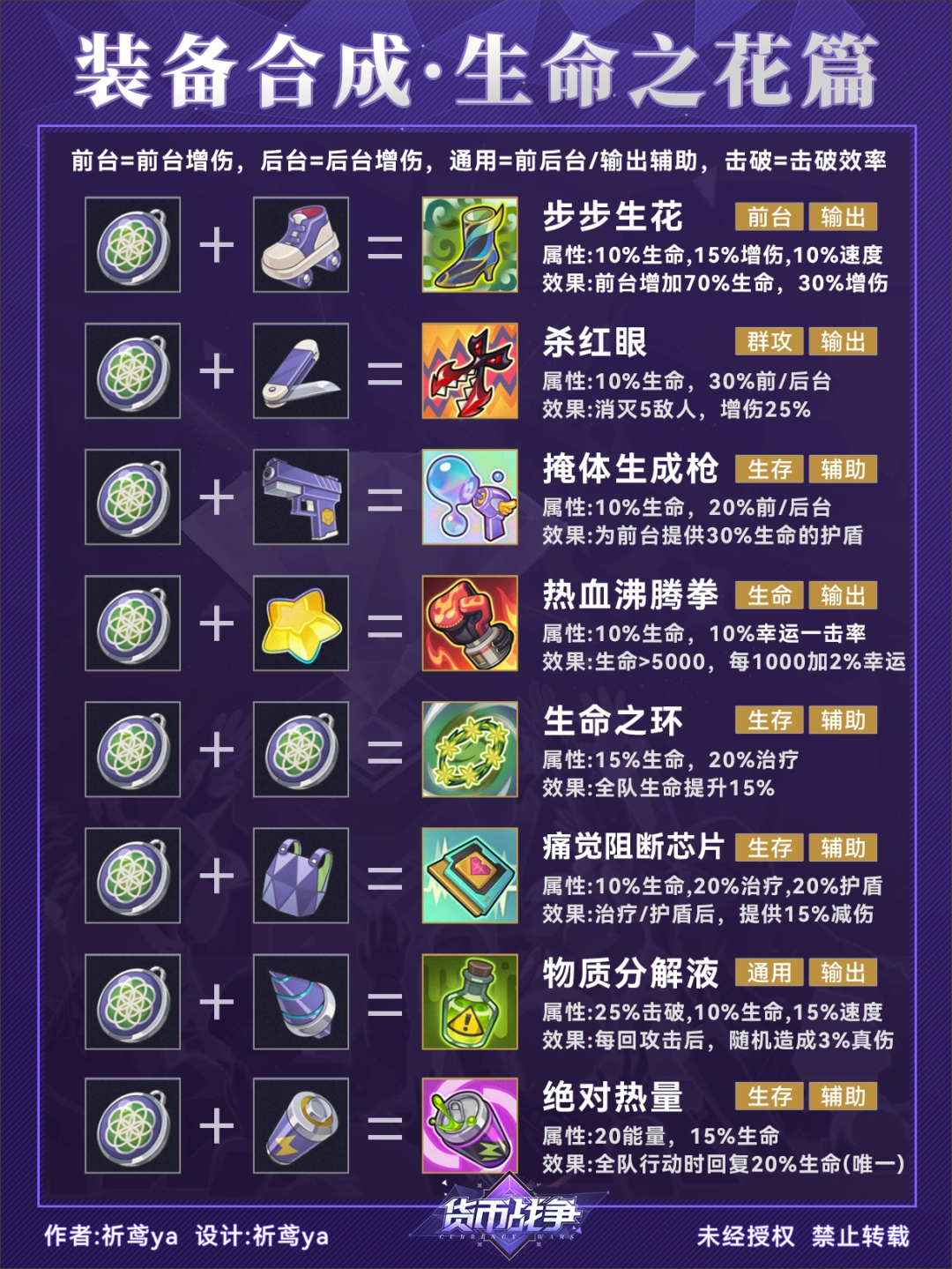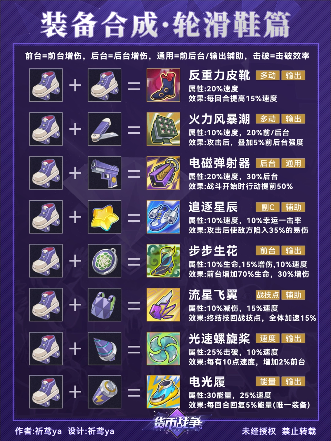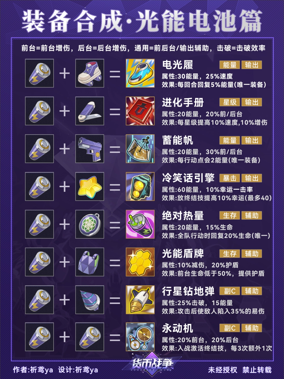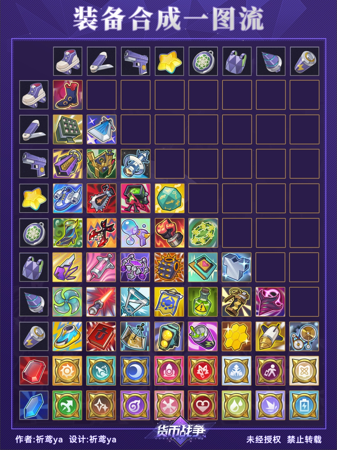 (3)由于装备的合成顺序没有特定要求,因此在合成图谱中可能会出现重复的配方组合(比如轮滑鞋+光能电池=电光履,光能电池+轮滑鞋=电光履)