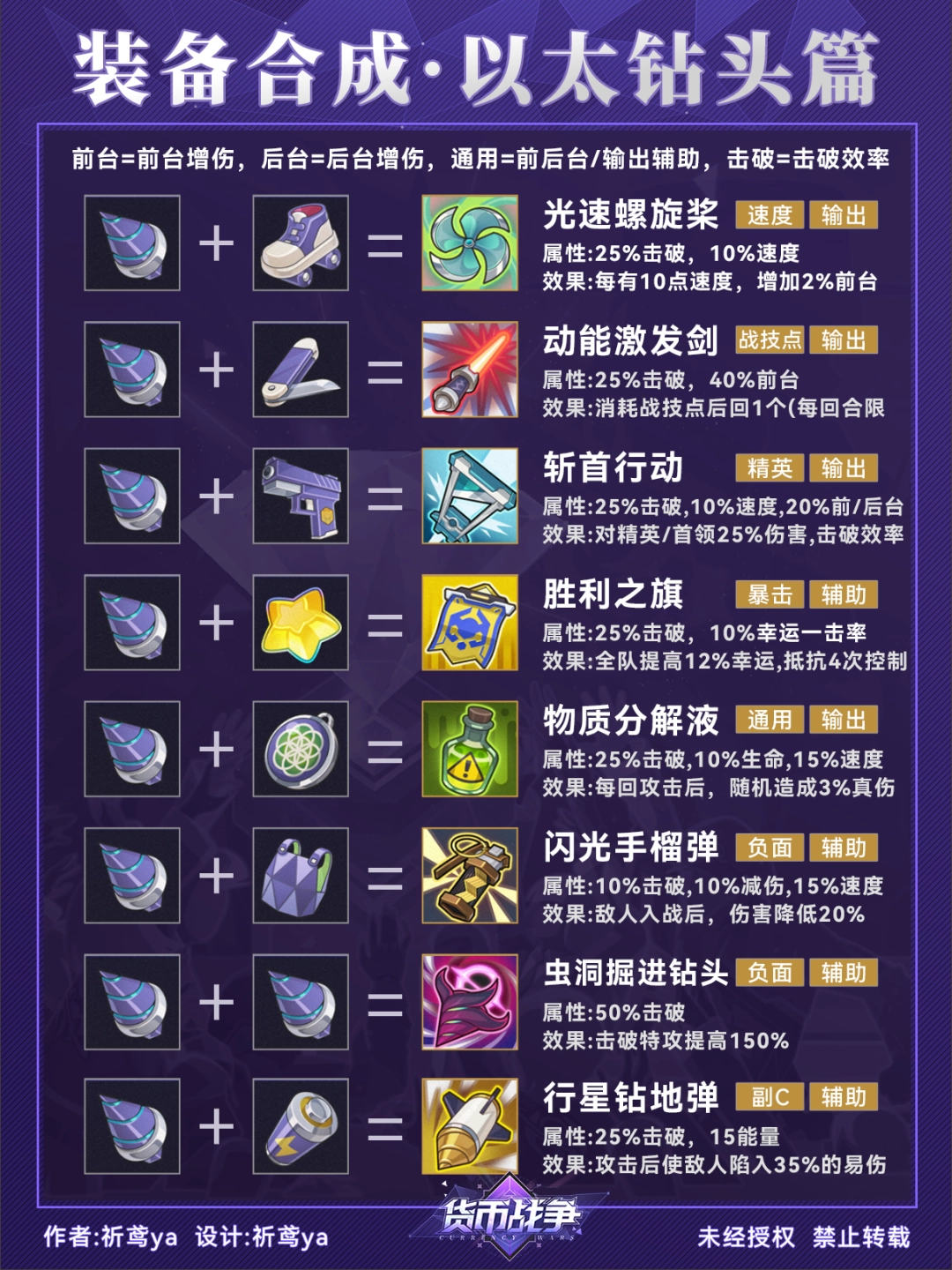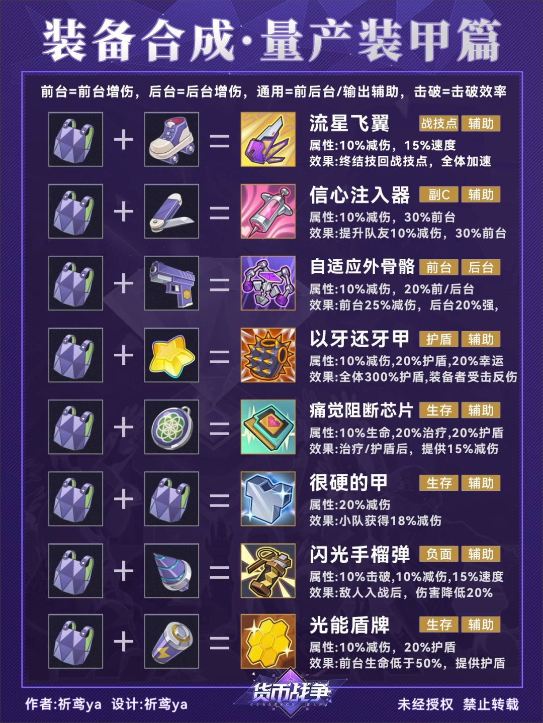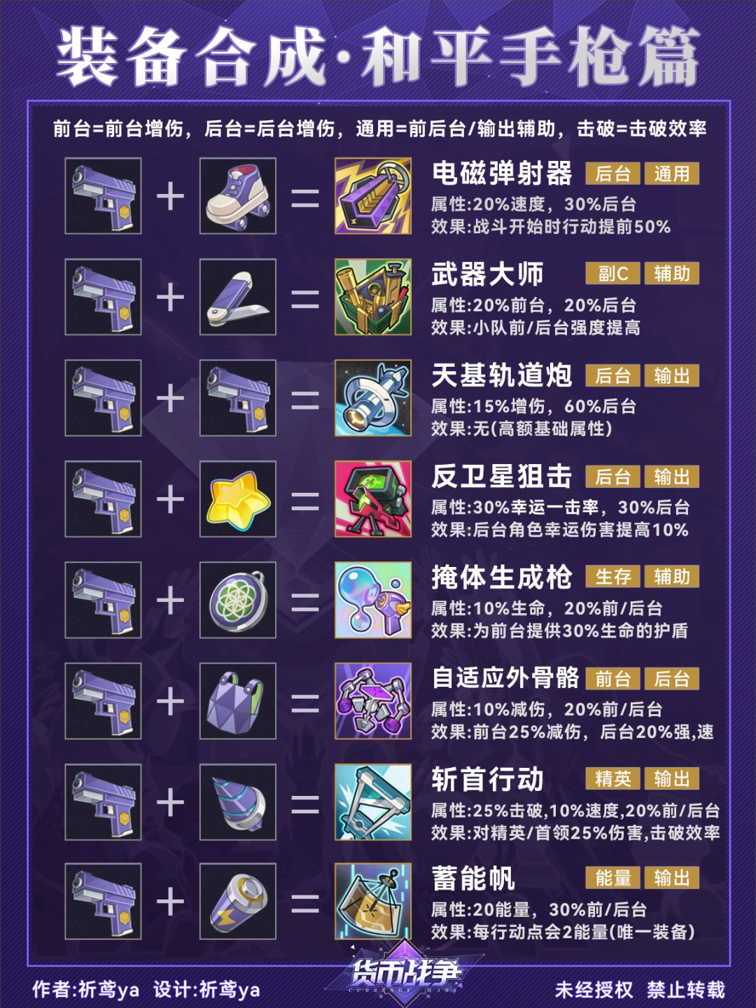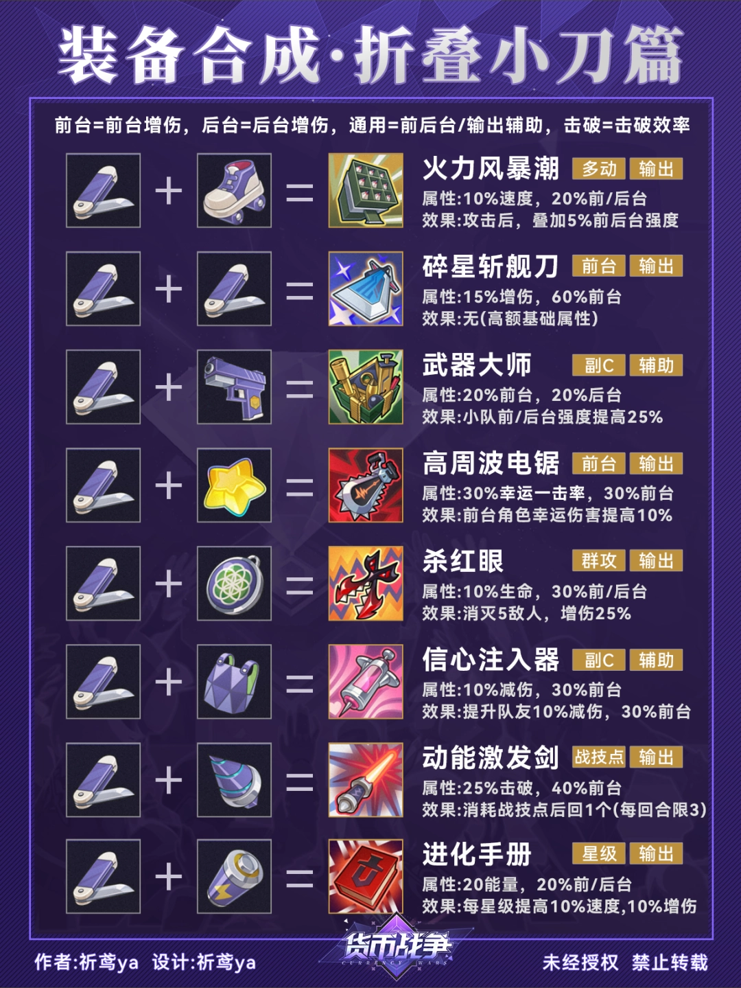(3)由于装备的合成顺序没有特定要求,因此在合成图谱中可能会出现重复的配方组合(比如轮滑鞋+光能电池=电光履,光能电池+轮滑鞋=电光履)
