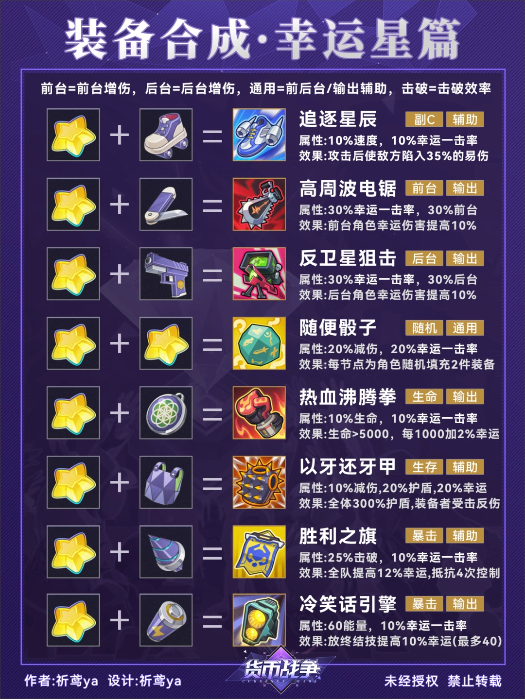 如果不想查看重复的配方组合,可以从两个相同装备的合成配方开始浏览(比如第4页,从幸运星+幸运星开始,就不会出现重复的配方)