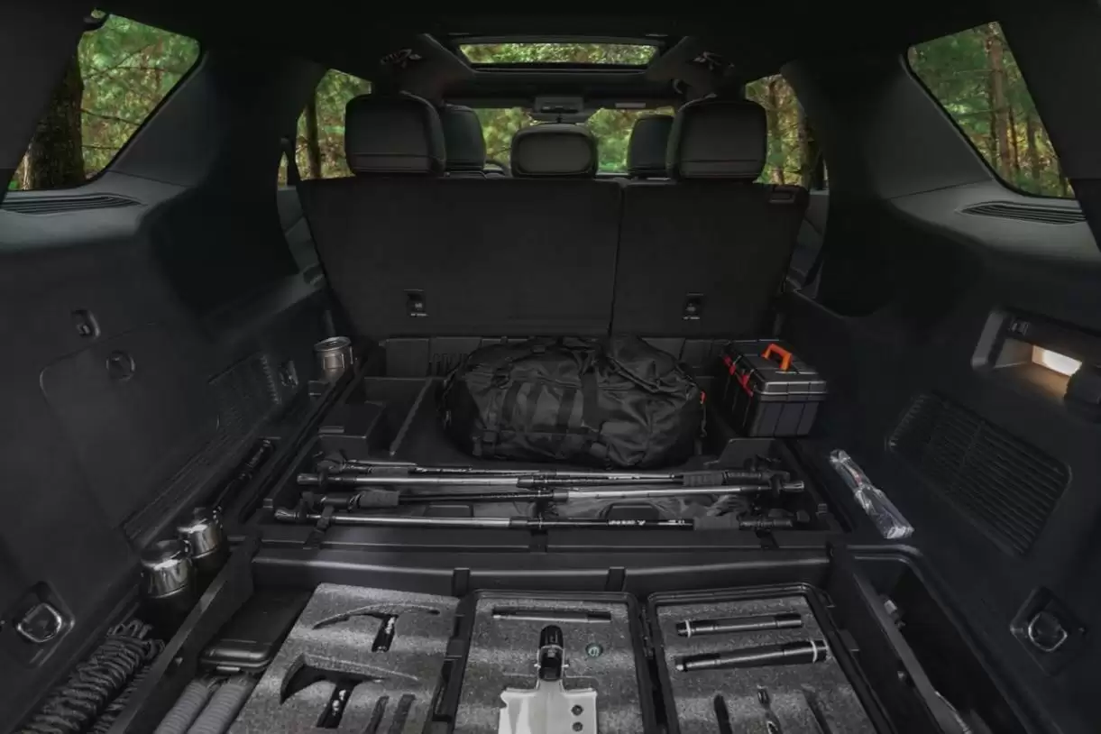 昆仑穿越版在继承硬核基因的基础上,针对户外储物需求进行优化。五座布局设计将后备箱常规容积提升至1505L,第二排放倒后可扩展至2487L,轻松容纳雪板、自行车等大件装备。新增的置物板下隐藏储物盒拓展近100L空间,配备15个精细化储物格与可移动挡板,实现物品分类管理。这种“魔变空间”设计,让户外装备收纳更高效,同时二排纯平放倒后可形成1.8米舒适大床,满足户外休憩需求。