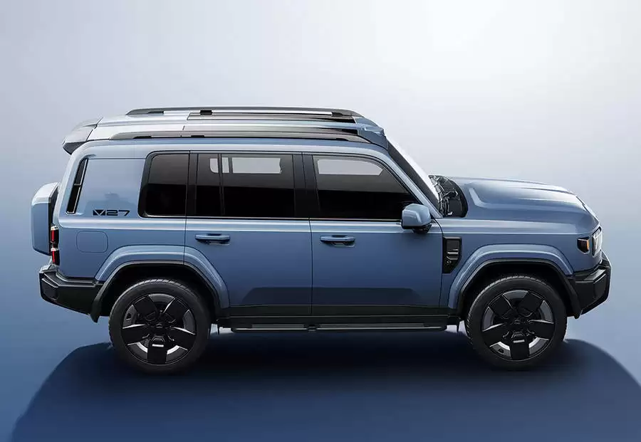 在设计语言方面,iCAR V27展现出独特的创新与传承精神。新车巧妙融合了经典硬派越野车的设计元素与前卫时尚的美学理念,窄幅式前格栅与方形灯腔、环形灯带的组合设计,不仅造就了强烈的视觉冲击力,更彰显出车辆与生俱来的硬朗气质。前包围处宽大的银色护板设计,进一步强化了这种富有力量感的越野美学。