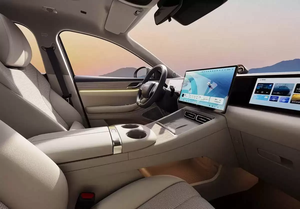 内饰设计上,ET5采用中轴对称的三屏布局,这也是星途品牌最新的设计语言,科技感十足。中控台下方依次排列空调出风口、无线充电面板,往后是杯架和带有镀铬饰条的扶手箱。中控台上方还设有一块物理钟表,为车内增添了一丝复古氛围。门板和中控台下方均配备氛围灯,整体内饰风格简约而不失格调。