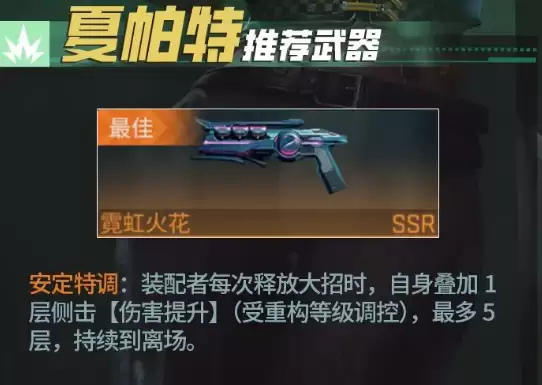 首推的顶级武器当属“虹火花”,其特效极为强力——每次释放终极技能后都能提升侧击伤害,最高可叠加5层效果,且持续时间会一直延续到夏帕特退场。不论是走侧击流派还是大招流派,侧击都是重要的伤害来源。叠加满5层后,侧击伤害将产生质的飞跃。随着培养深入,后期输出能力会更加惊人。