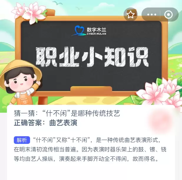 今天的小知识考验:你知道“什不闲”是哪一项传统民间技艺吗?【蚂蚁新村每日一题】2025年11月6日的题目已经公布!坚持答题,积累木兰币,就能助力家乡建设加速推进。答对本题,立刻就能获得“产速+3/时”的效率提升奖励!今天的正确答案是【曲艺表演】。“什不闲”又称“十不闲”,是一种传统的曲艺表演形式,在明末清初时曾广为流传。