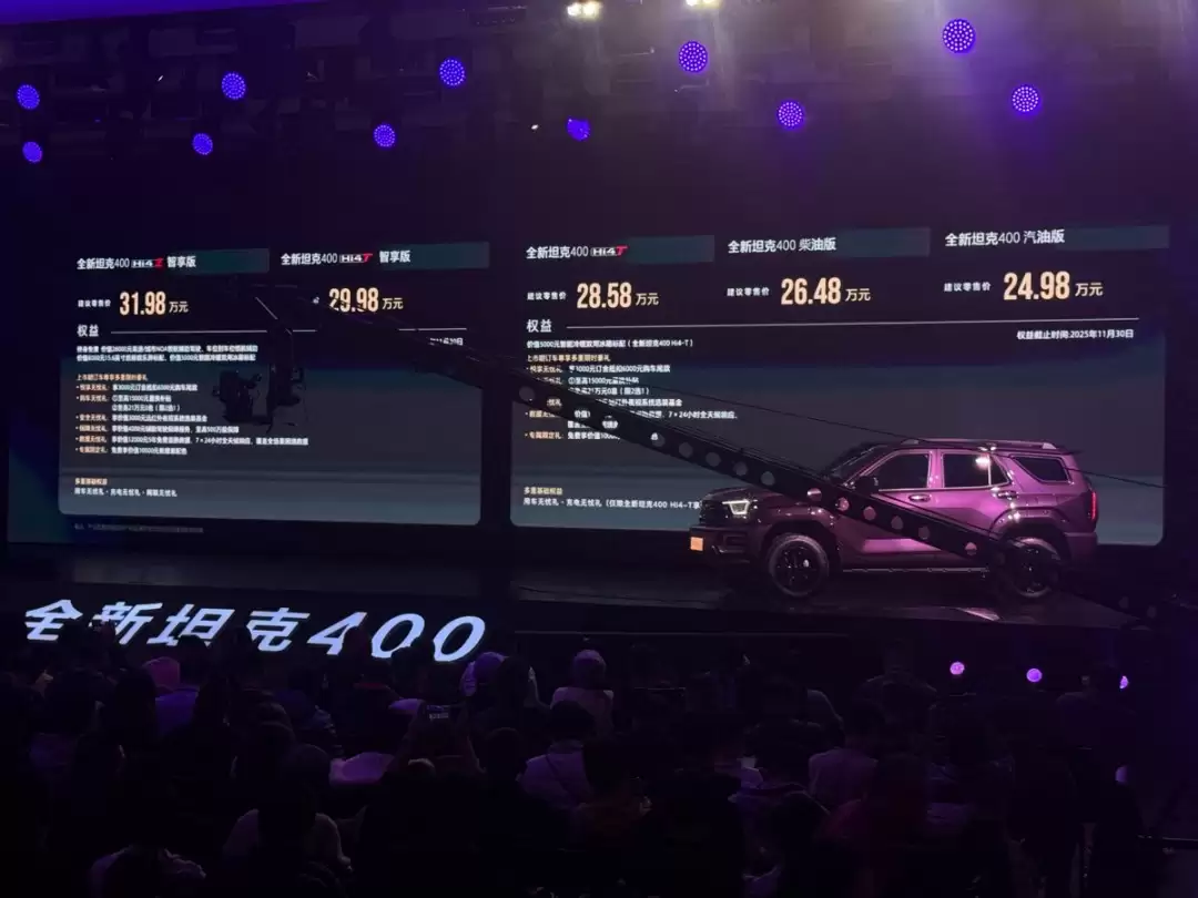 今天,备受期待的坦克400正式迎来全面升级并上市销售,共推出5款配置车型,价格区间覆盖24.98万元至31.98万元。新车在设计层次实现了多重突破,不仅在内饰质感、智能配置和智驾系统方面显著提升,还同步发布了Hi4-Z插电混动版本,同时对燃油版及柴油版车型进行焕新,整体产品竞争力进一步增强。