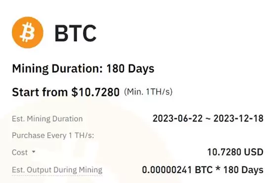 根据币安矿池介绍,目前每1Th/s的售价为10.7280美元,其中算力成本、电力成本分别为1.17美元、9.558美元,挖矿持续时间为180天,从6月22日开始,到12月18日结束,每购买1Th/s算力,将能够获取一定数量的BTC。