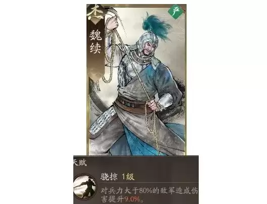魏续的核心优势在于低门槛高适配性。其天赋"骁掠"在面对高兵力敌军时可触发9%增伤,若搭配曹操的全域增伤效果,能显著提升平民武将的输出上限。该阵容构建逻辑采用经典铁三角体系:前排承伤、辅助增益、机动策应。建议将魏续与曹操、宋宪组成基础阵容。魏续定位为半肉主C,既承担前排伤害吸收,又具备核心输出能力;曹操作为全能辅助,不仅能提供增伤加成,还附带减伤效果;宋宪则扮演机动副C角色,可灵活进行战场牵制或补充伤害。