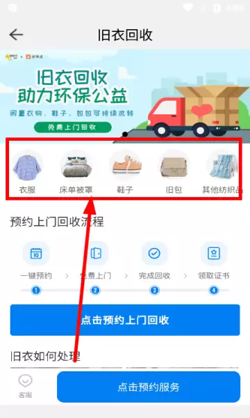 2、根据家中闲置情况,选择对应的回收品类(如冬装、夏装、床品等),并预约最方便的上门取件时间