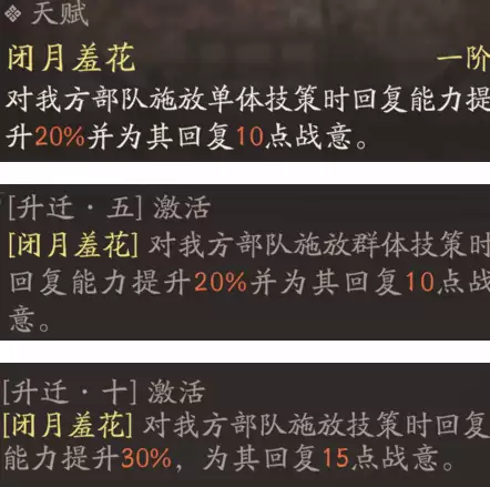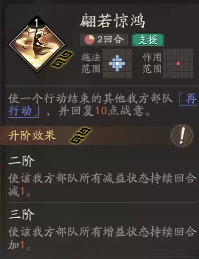 进行升迁搭配时首先要关注技能组合的选择。若天赋未达到特定要求,推荐使用"羽若惊鸿+舞影+扶危"的搭配思路。其中羽若惊鸿作为核心主动技能必不可少,扶危不仅能提供可观的治疗量,还能实现驱散效果,有效缓解生存压力。当天赋达到二阶以上追求压制效果时,可选择"羽若惊鸿+沉鱼落雁+援兵"的组合,沉鱼落雁带来的群体回血与战意回复效果显著,配合高阶天赋更能为全队附加增益状态。此外援兵技能可以弥补冷却期的输出真空,让战斗节奏更加流畅爽快。