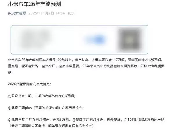 为支撑更远期的市场目标,小米汽车正加速推进产能布局。北京二期Plus项目(三期工厂总装车间)计划于2026年春节后投产,武汉一期工厂则定于同年5月启动,预计10月实现月产3.5万辆的规模。若产能爬坡顺利,叠加潜在的战略并购,2026年全年产能有望突破117万至120万辆。这种"自建+并购"的双轨策略,为产能快速释放提供了双重保障。