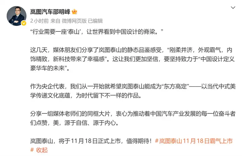 邵明锋强调,中国汽车设计需要展现文化自信与定力。他提出的“东方高雅”理念,正是希望以中式美学为尺、匠心为骨,通过当代设计语言传递文化底蕴,为时代留下独特的印记。他在博文中写道:“行业需要一座‘泰山’,让世界看到中国设计的脊梁。”这不仅是对岚图泰山的期许,更是对整个行业的呼吁。