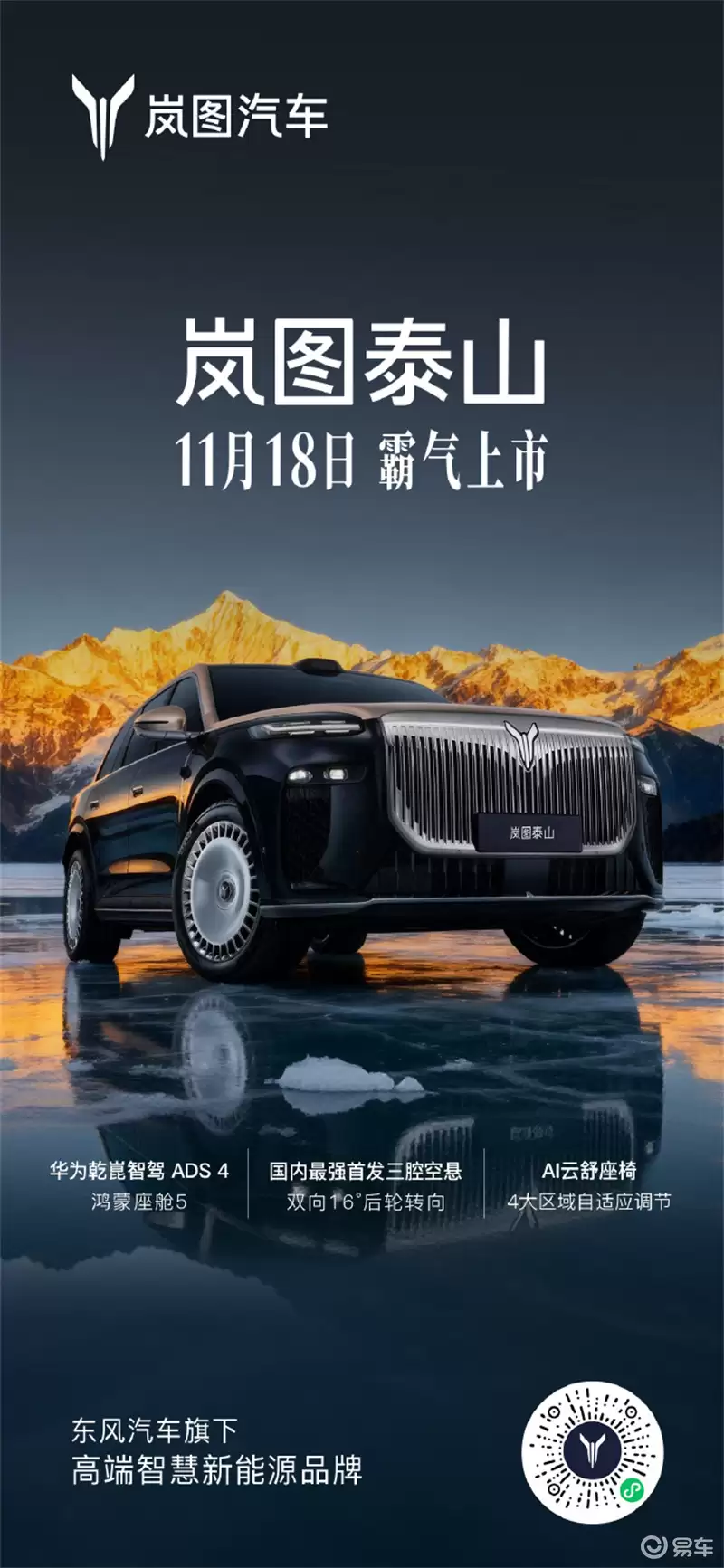 近日,岚图汽车CBO兼销售公司总经理邵明锋通过社交平台宣布,备受期待的新时代旗舰SUV岚图泰山将于11月18日正式亮相市场。这款车型以“东方高雅”为核心理念,旨在以现代中式美学展现深厚的文化底蕴,重新定义豪华汽车的未来发展方向。