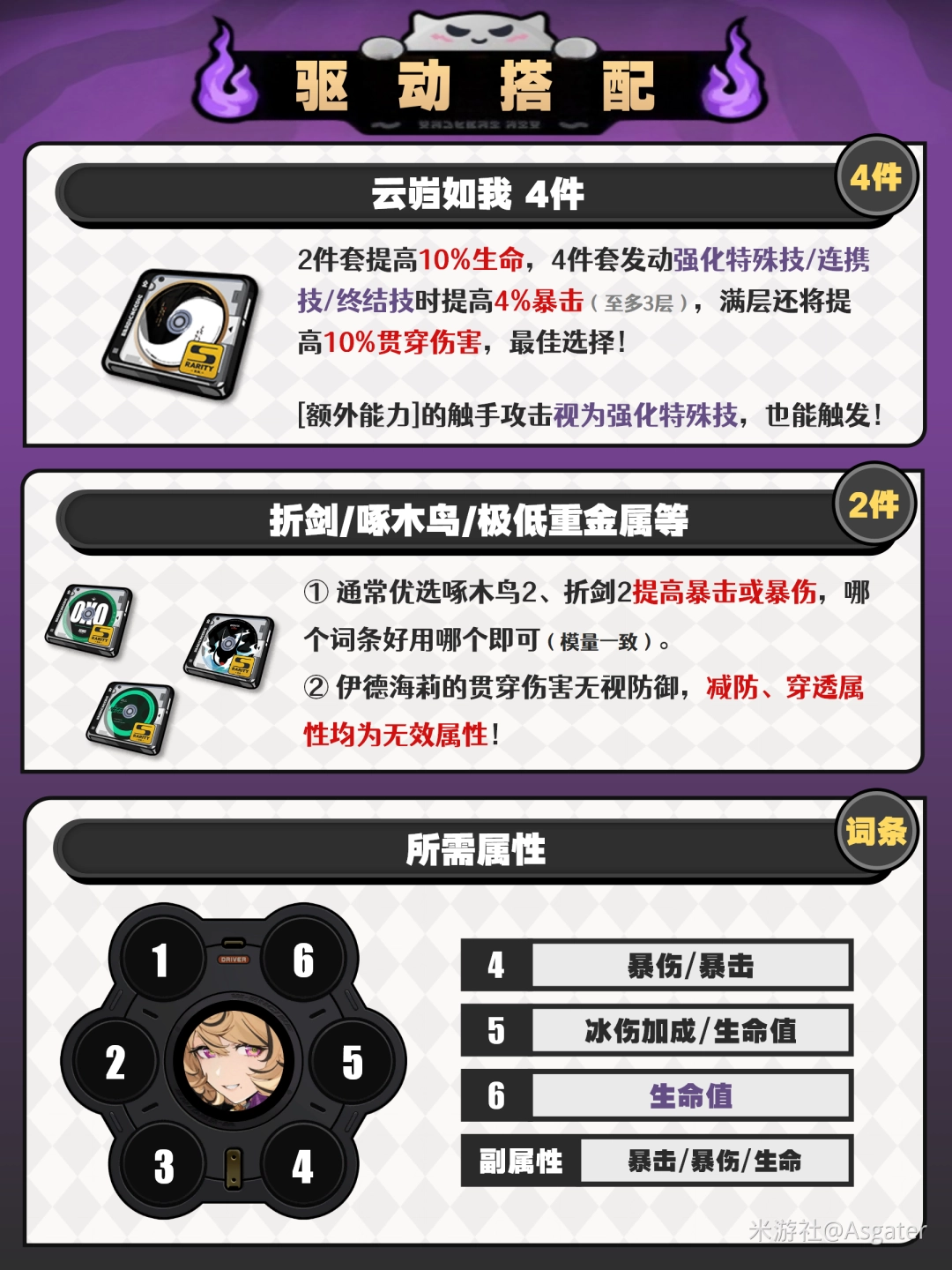 ② 5号盘优先考虑冰伤或生命属性,虽然伊德海莉的核心技能已经提供高额增伤,但由于贯穿力可同时从生命、攻击属性转化,加上还有贯穿力辅助角色的增益加持,整体来看冰伤盘收益仍略微优于生命盘。