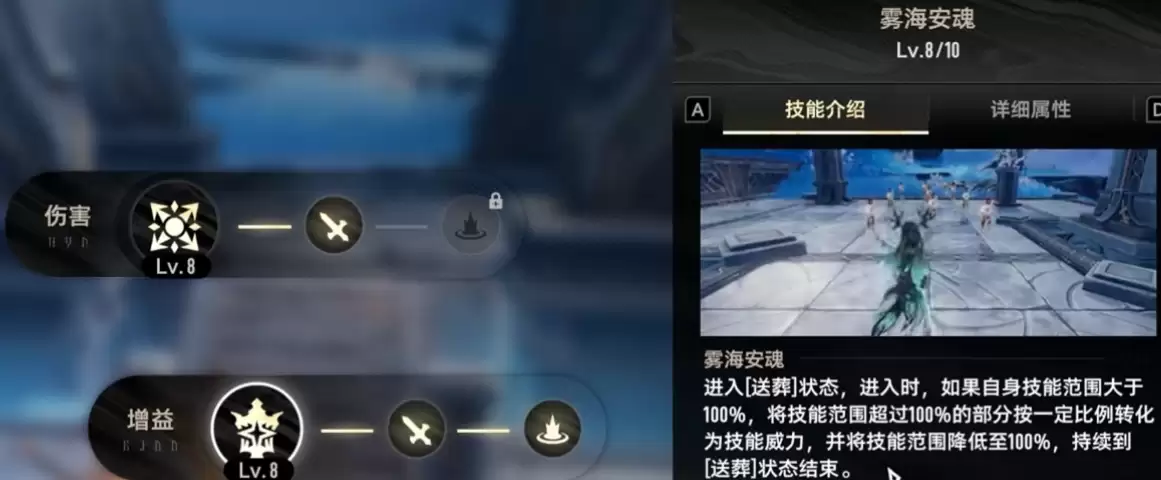 当挑战高难度副本时,珍维尔夫人还会展现出增益技能的效果,其中最引人注目的就是"雾海安魂"。此时角色会立即进入"送葬状态",每次释放技能的伤害加成都能超过100%,并且还会按不同比例快速提升大量伤害值,就连攻击范围也会随之扩大到原来的100%。甚至在任意状态下,她都能将聚怪、消耗神智等多种效果发挥到极致。