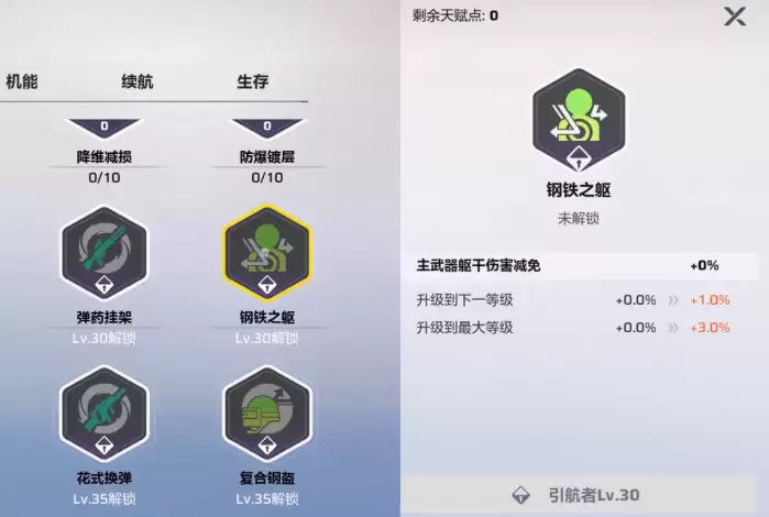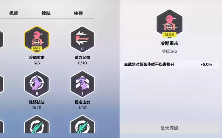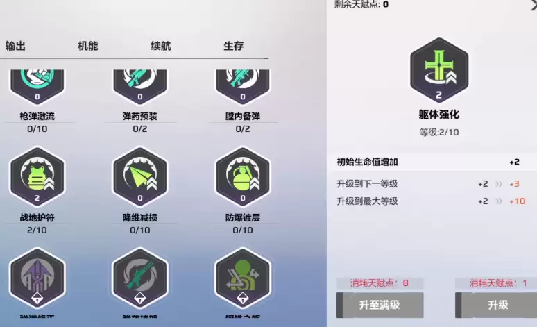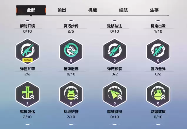 游戏中的天赋可以分为四大类别,分别用于提升角色的战斗输出、强化技能效果、增强持续作战能力,还包括一项生存设定用于强化角色的防御属性。玩家应该根据每个角色的实际需求,自由选择不同的天赋发展方向。如果在对战中选择了输出型角色,那么就需要优先强化角色的护盾防护和射击精准度,这样才能在对局中打出更亮眼的表现。