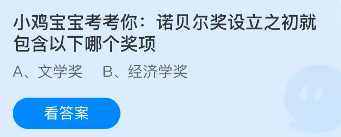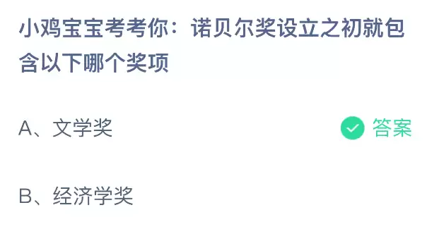 小鸡宝宝来考考你:诺贝尔奖在设立之初,究竟包含了哪些奖项呢?支付宝小鸡课堂开课啦!每天花一分钟时间答题赚饲料,喂养小鸡还能奉献爱心哦!轻松有趣又充满意义!2025年11月9日蚂蚁庄园小课堂题目“文学奖”是正确答案,根据诺贝尔奖的设立历史,最初设立的奖项包括物理学奖、化学奖、生理学或医学奖、文学奖与和平奖。