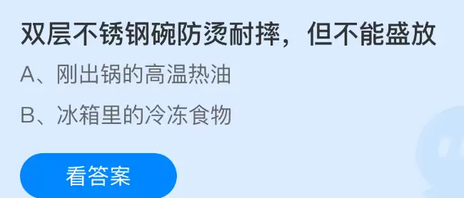 双层不锈钢碗虽然防烫耐摔,可千万别用它来装滚烫热油!支付宝小鸡课堂今天正式开讲啦!每天只需花一分钟答题赚饲料,喂喂小鸡就能轻松献爱心,既有趣又能做好事,何乐而不为呢?2025年11月10日蚂蚁庄园课堂的正确答案是【刚出锅的高温热油】——双层不锈钢碗特有的空心结构遇到高温热油时,内部气体受热会急速膨胀,在温差作用下,一旦超过碗体的承受极限就会引发炸裂,极易造成烫伤事故。