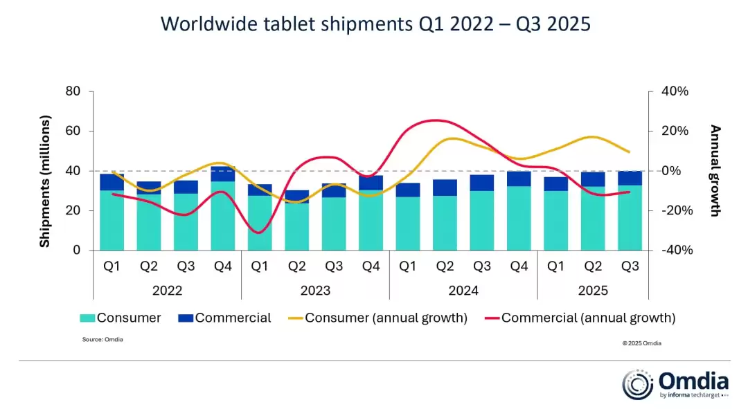 市场研究机构Omdia(前身为Canalys)最新发布的全球平板电脑市场报告显示,2025年第三季度(7月至9月)全球平板市场延续增长态势,出货量达到约4000万台,同比增长5.1%。这已是该市场连续第七个季度实现正增长,主要得益于中国市场的强劲需求以及中国厂商在中东和亚太地区的业务扩张。