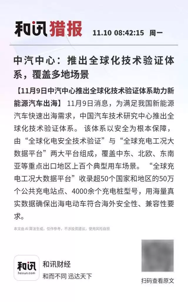 据了解,该体系的建立旨在破解中国新能源汽车在海外市场的"水土不服"难题。借助真实场景的模拟验证和大数据分析,企业可提前规避技术风险,缩短产品适配周期,从而提升中国新能源汽车在国际市场的竞争力。