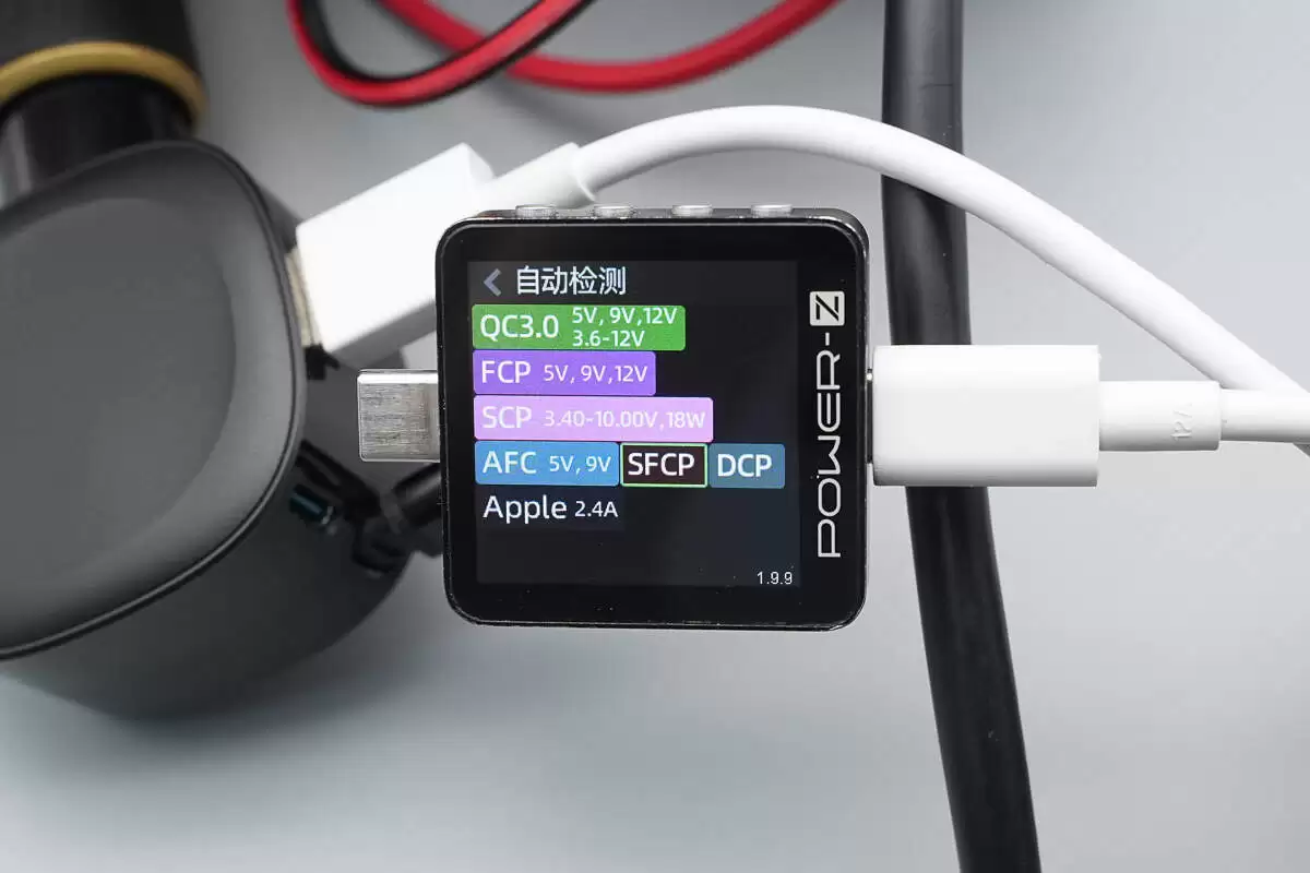 实测数据显示,该产品在12V/24V双电压输入下表现一致。USB-C接口支持QC3.0/4+、FCP、AFC、PD3.0、PPS等全协议,PDO报文显示具备5V3A、9V3A、12V2.5A三组固定电压档位,以及3.3-11V3A的PPS可调电压档位。USB-A接口同样支持QC3.0、FCP、SCP、AFC等主流协议,满足各类设备的充电需求。侧面数字显示屏可实时显示充电功率,用户无需猜测即可掌握充电状态。