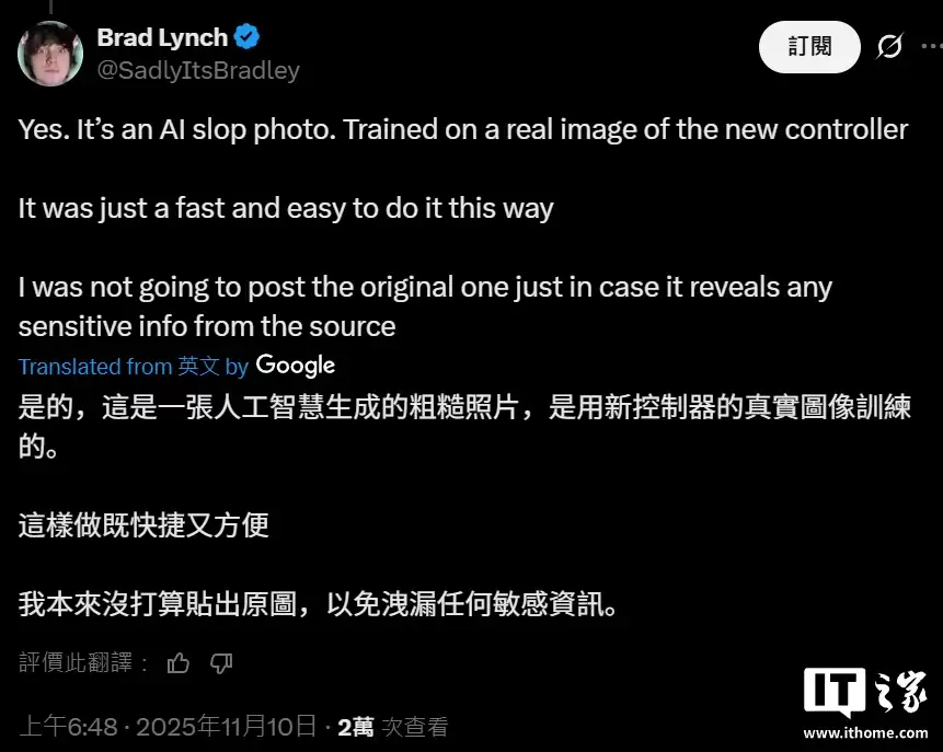 与此同时,Brad Lynch还公布了一张全新Steam手柄的概念图。不过这张图片使用了AI生成技术,基于实物图重绘以保护消息源。新手柄拥有完整的ABXY按键、十字键和双摇杆,但摇杆下方相比普通手柄设计了更长的隔板,并配备了两块触控板。
