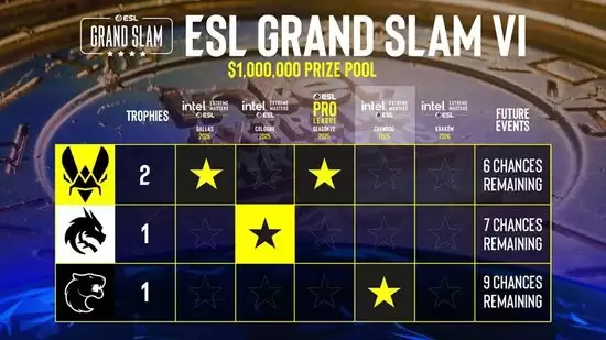 目前Vitality战队仍拥有六次机会去争夺另外三场EPT大师赛的冠军,最终目标是斩获高达100万美元的大满贯奖金。Spirit战队保有七次机会,而FURIA战队则拥有九次夺冠可能。