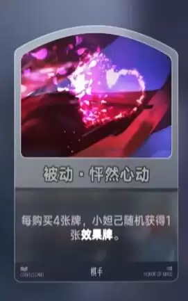 接下来是游戏中备受玩家喜爱的角色——小妲己。她的被动技能“怦然心动”在玩家每购买四张卡牌后,能随机获得一张效果牌。小妲己的秘技“心动节拍”在触发三次“怦然心动”后,可得到秘技牌“心之引力”,效果是获得三次临时刷新机会,并且在后续三次刷新时,商店中卡牌的购买消耗会减少一点。她的专属天赋“魅力无限”能让每回合打出的第一张效果牌触发两次效果。