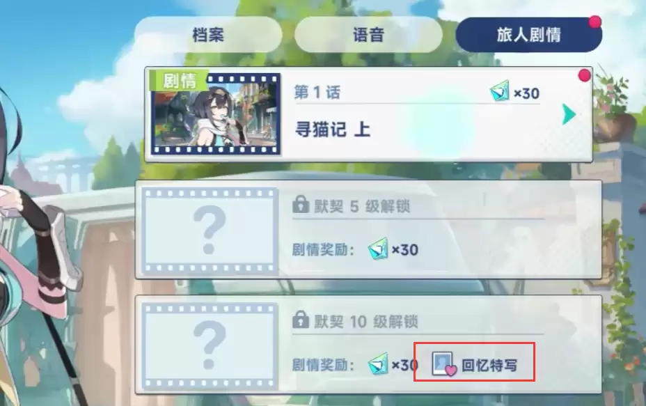 想要解锁特殊回忆,需要满足两个前置条件:首先玩家需要获得对应的角色,同时与该角色的默契等级达到零阶、五阶或十阶。只有成功解锁十阶默契值的专属剧情后,才能获得回忆特写,而回忆特写本身也是游戏中重要的收集要素。