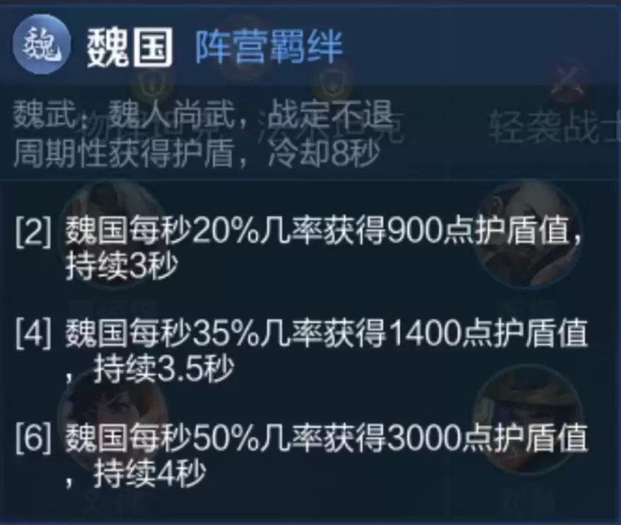 魏国羁绊在游戏中同样非常强势,只需凑齐两名魏国角色即可激活。每秒钟有20%的概率获得900点护盾,这个护盾值看似不错,但触发概率确实不算太高,一整局对战中触发的次数相当有限。不过当玩家上阵六名魏国角色时,所有魏国角色每秒都有50%的概率获得3000点护盾,而且这个护盾能够持续4秒,可以说相当强悍了。