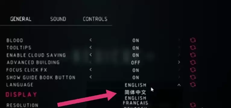 进入设置页面后,这里包含了声音、画面、控制等多种选项。我们的目标是找到语言设置模块,在页面中定位到“language”这一项。初次进入时,这里默认显示的是“English”,因为游戏初始语言就是英文。